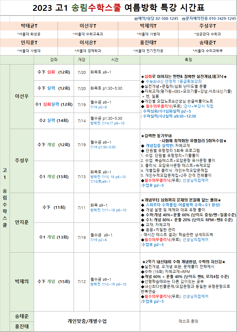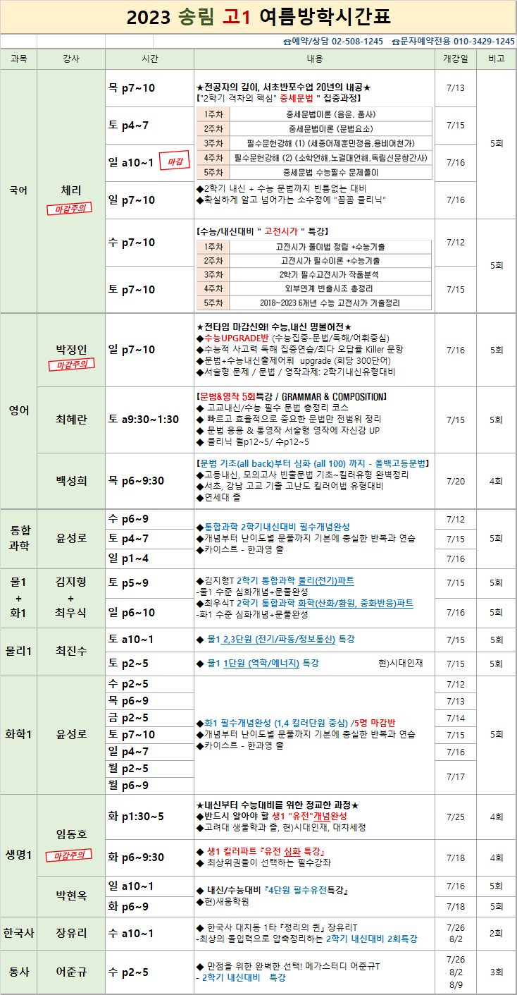 2023 송림 고1 여름방학시간표