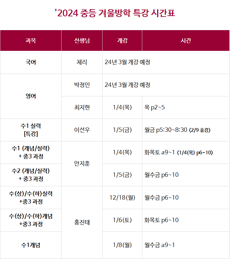 2024 송림 중등 겨울방학 시간표