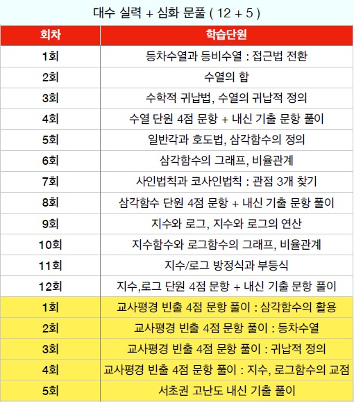 - 100분 실전모고 진행 : 대수~미적분 진도에 따른 누적 모의고사